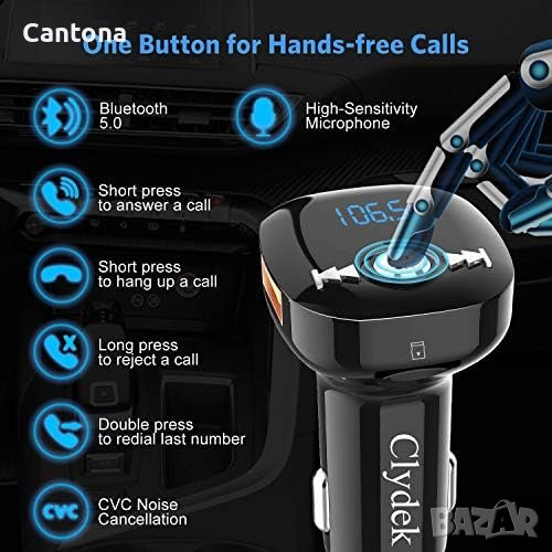 - С технологията за анулиране на шума CVC, Bluetooth FM предавателят ще елиминира околния шум и ще осигури непрекъснато обаждане със свободни ръце. Отговаряне/повторно набиране/отхвърляне или прекратяване на повикване само с щракване върху бутон. Превключвайте безпроблемно между разговори и музика. Вграденият високочувствителен микрофон прави разговорите със свободни ръце по-плавни, което прави шофирането ви по-безопасно и удобно.