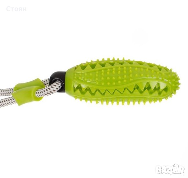 Играчка за куче с голяма вендуза, която се поставя стабилно на пода или стената и дълга връв с гумена топка. Меките шипове на топката почистват зъбите на кучето, докато играе и релаксира, докато добавянето на суха храна вътре в топката ще направи забавлението му още по-голямо. Занимава вашия домашен любимец, докато се грижи за зъбите му.