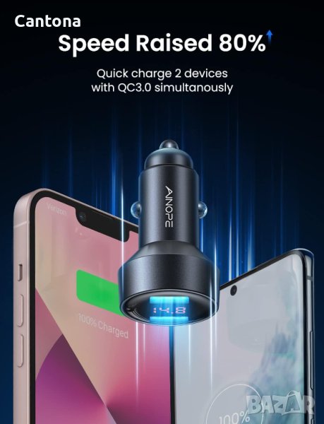 - С обща мощност от 36 W, зарядното устройство за запалка AINOPE може да зарежда две устройства едновременно със скорост QC3.0 и да зарежда от 0 до 55% за 35 минути. Адаптерът за бързо зареждане AINOPE QC3.0 предлага 4 пъти по-бързи скорости на зареждане за съвместими устройства