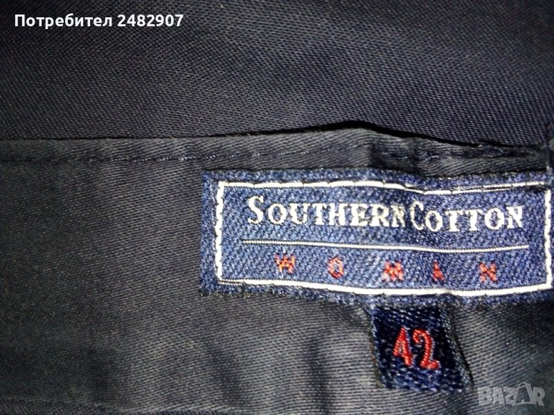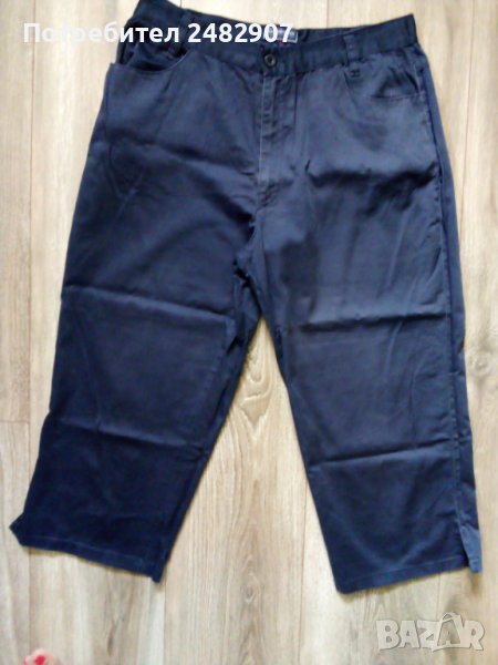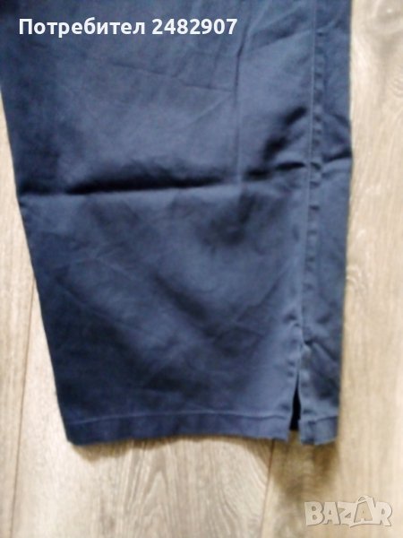 Дамски тънък 7/8 панталон от тъмно син памучен плат, размер 42. Ширина в талията - 38 см, дължина от талията до чатала - 29 см, дължина от талията до долу - 76 см, ширина на крачола в долната част - 22 см. Закопчаване с цип и копче отпред, гайки на талията, два джоба отпред и малки цепки в долната странична част на крачолите. Запазен, с нормални следи от износване.
