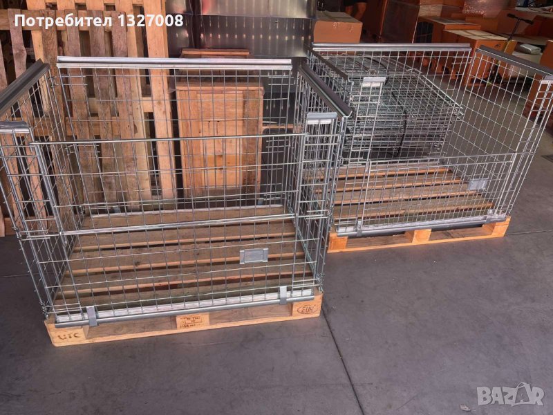 Нови метални бокспалети с външни размери 1220 х 825 х в.1000 mm и вътрешни размери 1150 х 740 използваема вътрешна височина 850 mm; с половин отваряща се странѝца на една от страните(вижда се на снимките); с кукички за фиксиране към дървения палет; с възможност за поставяне един върху друг; размер на отворите на решетката 65 х 120 mm – решетката е с дебелина на прътите 5 и 10 мм, покритие - електролитно поцинковани (сребристо сив цвят). Товарен капацитет до 500 кг, посочената цена е само за металната част (дървеният палет не е включен – стандартен европалет с маркировка EUR), сгънат размер 1940 х 900 х в.70 mm. Тегло 30 кг без дървения палет