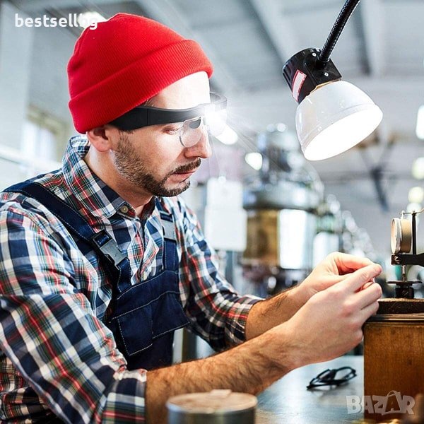 Регулируема LED Светлина: За да осигурите оптимално осветление, лупите разполагат със 2 регулируеми LED светлини. Просто натиснете бутона на рамката на очилата, за да превключите между две нива на яркост. Това ви позволява да адаптирате светлината към текущата задача и да видите всеки детайл ясно.