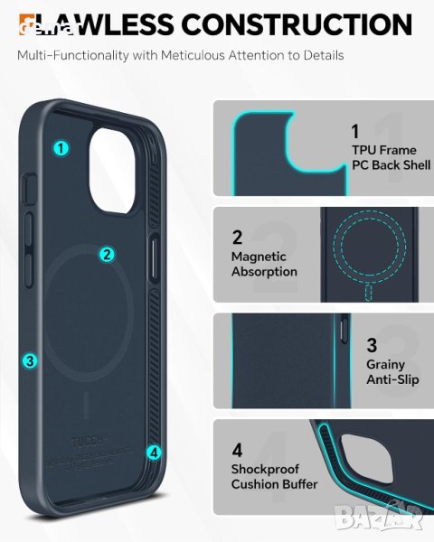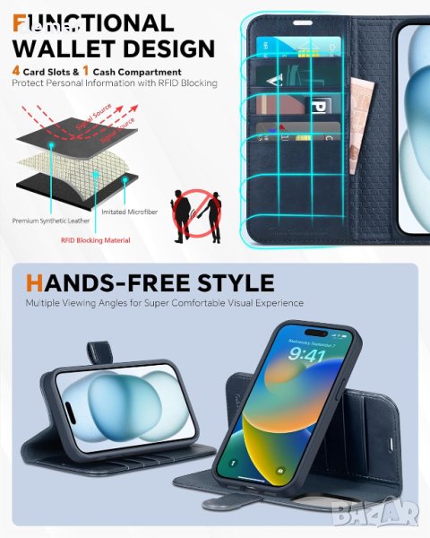 Мултифункционалният разглобяем 2-в-1 PU кожен калъф-портфейл на TUCCH, специално проектиран за iPhone 15 Plus (6,7" 2023), предлага гъвкавост, защита и удобство. Изработен от първокласна PU изкуствена кожа с удароустойчива TPU рамка и издръжлив заден капак, разполага с безшевно кожено магнитно затваряне, осигуряващо защита на цялото тяло с прецизно внимание към детайла. Калъфът е съвместим с безжично зареждане чрез просто премахване на задния капак, но не и когато е прикрепен. Той предлага две опции като калъф за портфейл или заден капак чрез вграден магнити и се адаптира към различни аксесоари за допълнително удобство.Дизайнът на портфейла включва RFID блокираща защита за 4 слота за карти, защитавайки информацията за вашата карта.Прецизните изрези осигуряват лесен достъп до всички функции, а стойката за свободни ръце позволява пейзажен режим за видео разговори и филми.