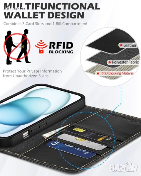 Изработен от 100% истинска восъчна телешка кожа, калъфът SHIELDON предлага елегантна повърхност против надраскване за вашия iPhone, подобряваща се с употреба. Не само стилен аксесоар, но и функционира като портфейл с три слота за карти, отделение за пари и усъвършенствана технология за блокиране на RFID за защита на вашата лична информация. Издръжливата мека TPU вътрешна обвивка осигурява удароустойчива защита срещу надраскване, изпускане и удари, с увеличени устни около обектива за защита на камерата. Калъфът също така разполага с невидима стойка за регулируема видимост, сигурно магнитно затваряне и прецизни изрези за непрекъснато използване на портове и функции, гарантиращи практичност заедно със защита на цялото тяло.