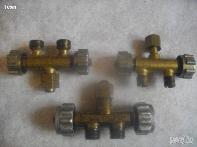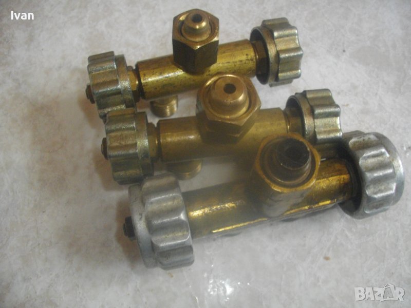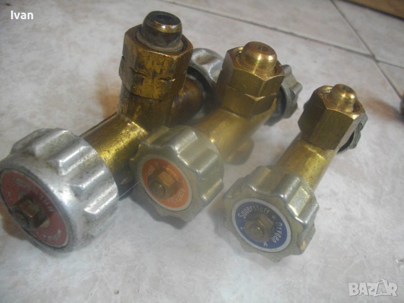 Налични: 1 бр. малко ползван за газ пропан.бутан, 1 бр. НОВ за ацетилен и 1 бр. НОВ за кислород. И трите троиника са масивни месингови, с двойно регуллиране/реглаж посредством спиратеелни кранове от двете страни с алуминиеви въртоци големи. Дължина на троиниците - 11 см.