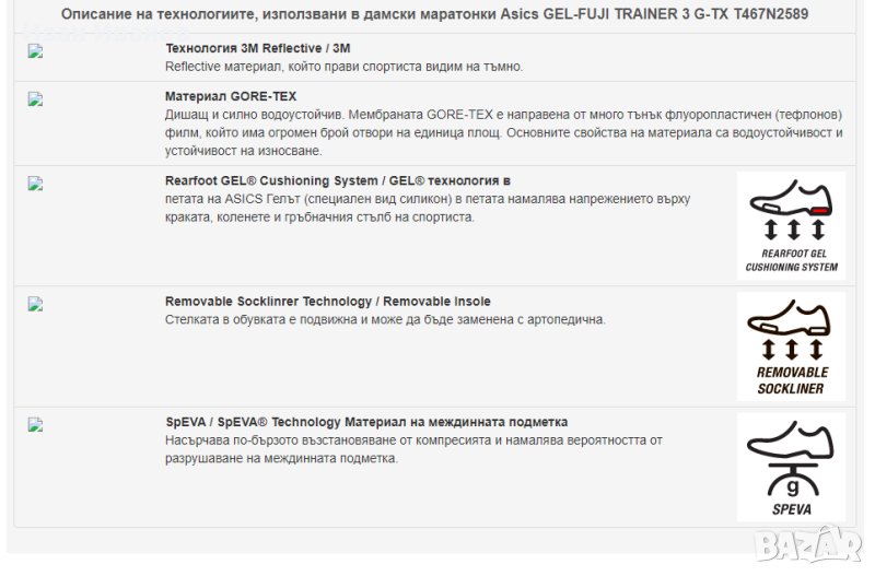 Дамски маратонки Asics за пътека .Използвани два пъти , като нови , без следи и забележки Маратонките Asics GEL FUJI TRAINER 3 GoreTex са преди всичко еталонно сцепление на всякаква повърхност - изключително агресивната шарка на протектора ще осигури надеждна стабилност, както с рохкав сняг, така и с почва, а мембраната GoreTex гарантира, че краката ви ще останат сухи в всяко лошо време.Омекотяването на GEL FUJI TRAINER 3 GoreTex е доста добро, особено приятно изненадващо в предната част на обувката. В същото време малка разлика във височината в предната и задната част на обувката ще ви позволи да покажете отлични резултати на разстояние.Лека обувка за всякакви терени с отлично усещане за земятаВтората версия на GEL-FUJI TRAINER е по-лека от своя предшественик и има малко по-ниска междинна подметка за по-добро сцепление.ASICS Gel® (специален вид силикон) в петата - намалява натоварването върху петата, коленете и гръбнака на спортиста.SpEVA® - Материалът на междинната подметка насърчава бързото възстановяване от компресията и намалява вероятността от разрушаване на междинната подметка.Trustik® System - Формован елемент, разположен под централната част на подметката. Осигурява стабилност, лекота и предпазва от усукване на крака.На петата на маратонките GEL FUJI-TRAINER 3Вдъхновено от планината Фуджи в Япония, може да се намери отличителното отразяващо лого на FUJI.Офроуд подметката с реверсивна протекторна част осигурява отлично сцепление по време на спускане и изкачване по всички видове пътеки.Горната част има минималистичен дизайн, специално проектиран да отвежда влагата и да поддържа ботуша лек при всякакви метеорологични условия.Описание на технологиите, използвани в дамски маратонки Asics GEL-FUJI TRAINER 3 G-TX T467N2589Технология 3M Reflective / 3MReflective материал, който прави спортиста видим на тъмно.Материал GORE-TEXДишащ и силно водоустойчив. Мембраната GORE-TEX е направена от много тънък флуоропластичен (тефлонов) филм, който има огромен брой отвори на единица площ. Основните свойства на материала са водоустойчивост и устойчивост на износване.Rearfoot GEL® Cushioning System / GEL® технология впетата на ASICS Гелът (специален вид силикон) в петата намалява напрежението върху краката, коленете и гръбначния стълб на спортиста.Removable Socklinrer Technology / Removable InsoleСтелката в обувката е подвижна и може да бъде заменена с артопедична.SpEVA / SpEVA® Technology Материал на междинната подметкаНасърчава по-бързото възстановяване от компресията и намалява вероятността от разрушаване на междинната подметка.Asics продължава активно да развива своята гама от маратонки за пътека. Колекциите все по-често включват две версии на офроуд модели: класически горнище и водоустойчиво горнище с мембрана Gore-Tex. Тестваме водоустойчива версия на най-популярните SUV на японската марка - Asics Gel-Fuji Trainer 3 с надпис GTX. Трябва да се отбележи, че класическият Asics Gel-Fuji Trainer 3 има същите характеристики на движение като своя водоустойчив брат. Истината е, че седи по-меко на крака и диша по-добре - колкото и да се развиват мембранните технологии, инженерите на Gore-Tex все още не са успели да постигнат идеалния баланс на защита от влага и отстраняване на влага. Но честно казано, нека кажем, че използването на мембрана Gore-Tex в маратонките за бягане е най-добрият вариант за водоустойчивост и дишане.Fuji Trainer 3 GTX - нископрофилни маратонки: височина на тока - 18 мм, височина на пръстите - 10 мм. Това ви пома