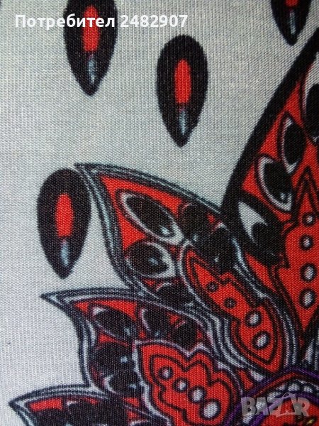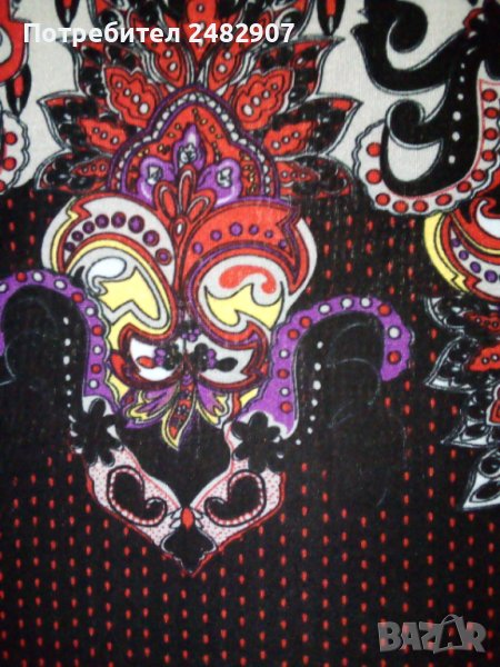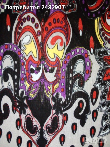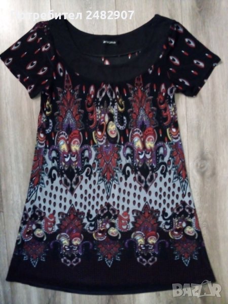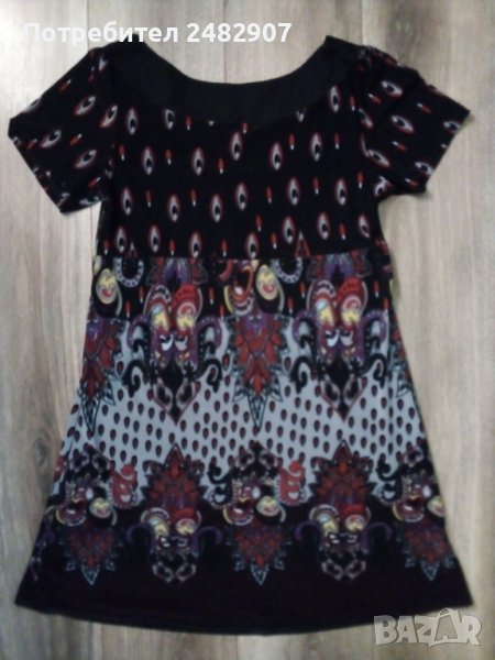 Пъстра ефирна дамска рокля/туника от ликра с къс ръкав, размер S. Ширина в раменете - 37 см, ширина под мишниците - 45 см, ширина в долната част - 66 см, дължина от рамото до долу - 86 см, дължина на ръкава от рамото - 20 см, ширина на ръкава в долната част - 16,5 см. Много запазена, почти не е използвана, отлично състояние, без забележки.