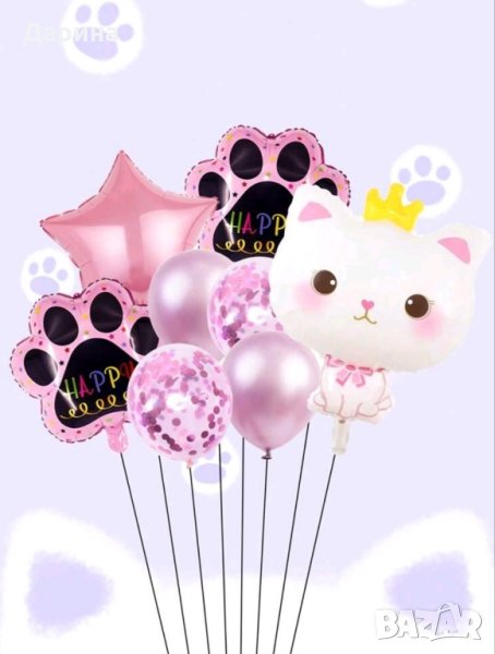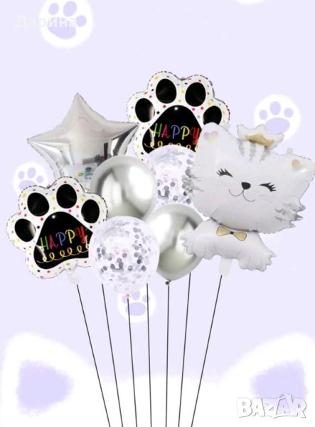 Парти сет балони Коте. Състои се от 1бр. голям фолиев балон Коте, 2бр. фолиеви балони лапички, 1бр. фолиева звезда, 2бр. латексови балони и 2бр. прозрачни балони с конфети. Парти сет зайче - 20лв./10.23€. Парти сет коте с цифра 80см - 25лв./12.78€. Нови.