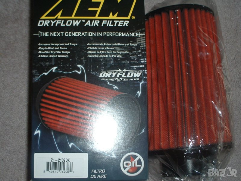 Универсален спортен въздушен филтър AEM подходящ както за турбо, така и за атмосферни двигатели.