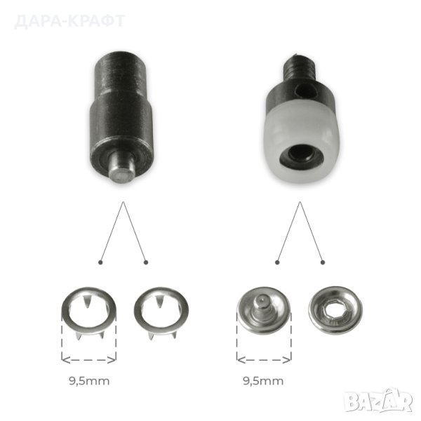 !: Комплектът матрици е предназначен за съответния размер и тип копчета и изисква използването на преса (не са включени към този продукт)