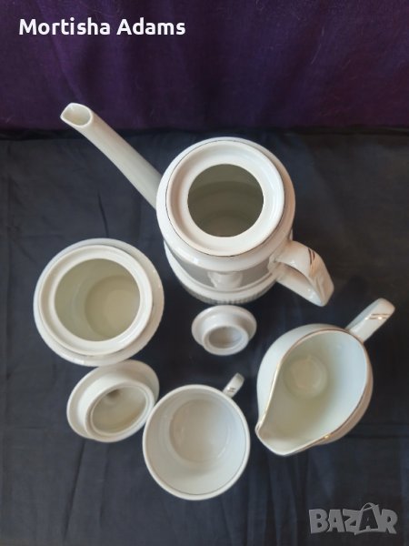 Неупотребяван сервиз за чай с липсващи латиера и чашка, български порцелан на "Изида". Латиерата е заменена с друга, на същия производител. Мисля, че пасва чудесно на останалите части от сервиза.
