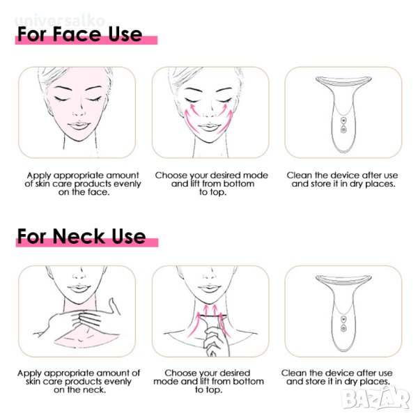 Уредът е предназначен за стягане и подхранване на кожа от всякакъв тип. Спомага за изглаждане на бръчки, лифтинг, на лице и най вече на проблемната зона на деколтето и шията. Подходящ е за използва и в зоните около очите спомагайки за премахване на тъмните кръгове.