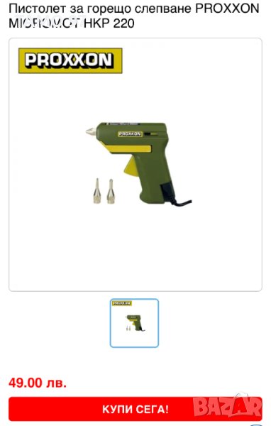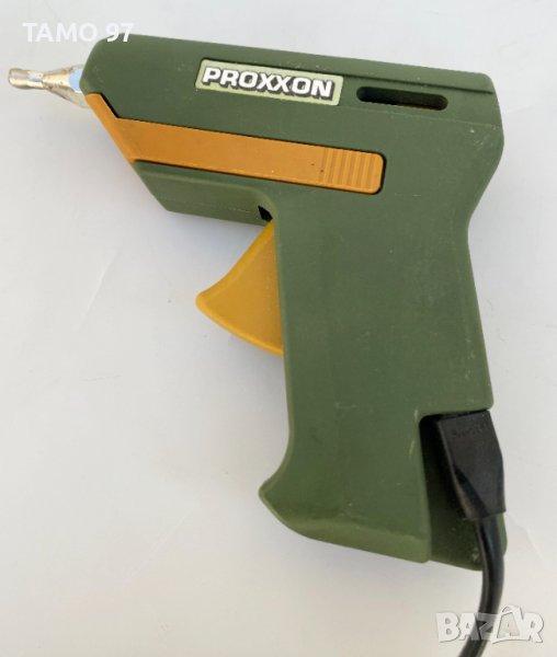 а Proxxon в отлично визуално и техническо състояние, внос от Франция. Бързо и надеждно залепване на метал, пластмаси, плексиглас, стъкло, керамика, камък, картон, кожа, полистиренни пени, текстил и много други. В зависимост от материала по който се нанася лепилото, то се фиксира за около 30 секунди, позволявайки коригиране на положението на детайлите, за разлика от моментните лепила. Лепилни пръчки 7 мм, перфектни за деликатна работа, като конструиране на модели, изработка на играчки и бижута, аранжиране на сухи цветя и много други. Чувствителен, прецизен, механичен механизъм за правилното подаване на силикона към дюзата. Вградено краче - за удобство когато не се използва. Кратко време на загряване. Пращаме с опция преглед и тест с куриерска фирма еконт може и лично предаване за гр. Шумен.