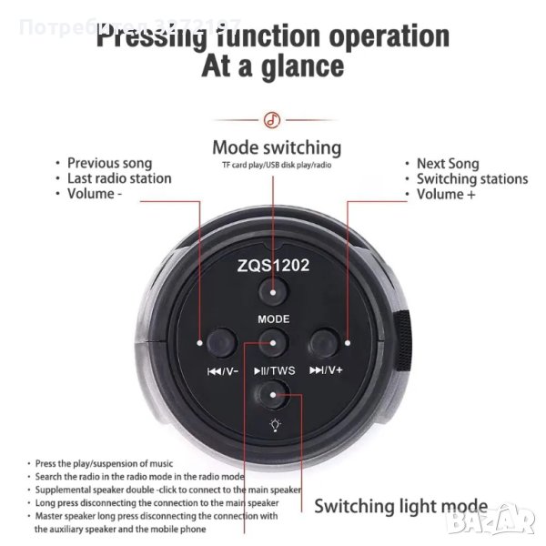 S12 Bluetooth мощен високоговорител - субуфер ,FM радио,множество LED светлини (програмируеми),слот за флашка + слот за карта ,TWS функция за свързване с допълнителен високоговорител,високо качествен HI FI звук.