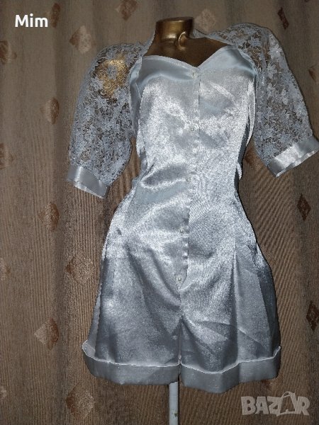 Бял гащеризон от плътен еластичен сатен и дантела на цветя. Закопчаване е отпред копчета- перли .Подмишници 52 см едностранно, талия 44 см едностранно, ханш 53 до 60 см едностранно, дължина 90 см,широчина на крачола 35 см едностранно. Няма забележки.