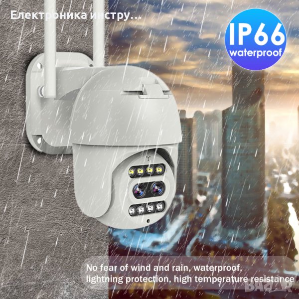 2021 Wifi камерата Dual Lens PTZ e водоустойчива и е подходяща за външни условия, може да се настрой и монтира за няколко минути, без необходимост от допълнителни устройства. Защитата за водоустойчивост е IP66.