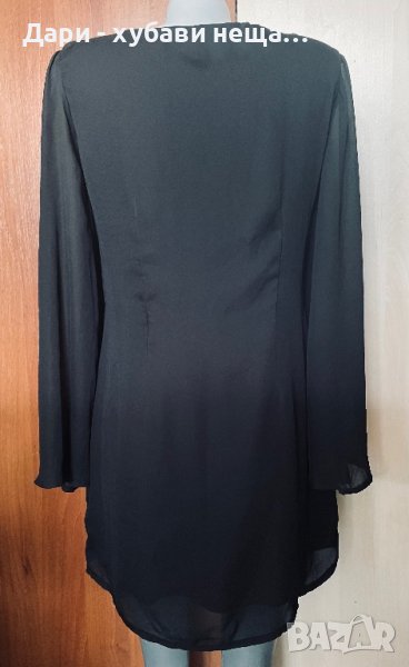 Рокля от полиестер с подплата и с прозрачни разкроени ръкави.Има украса, подобна на колие- сребристо и синьо зелено.Гърбът има леко вталяване.Липсва хартиения етикет.