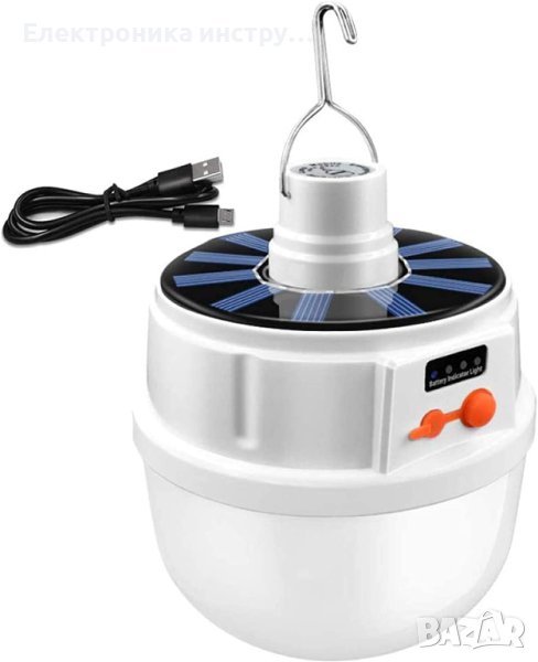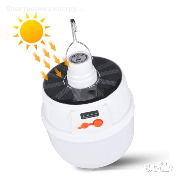 Къмпинг лампа с кука за закачане и 5 режима на светене. Мощна и удобна акумулаторна къмпинг LED лампа за закачане с вградени батерии и соларно зареждане през деня и USB кабел нощно време. Идеална е за къмпинг, за градина или ремонтни дейности.