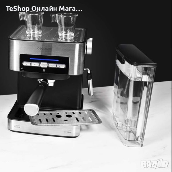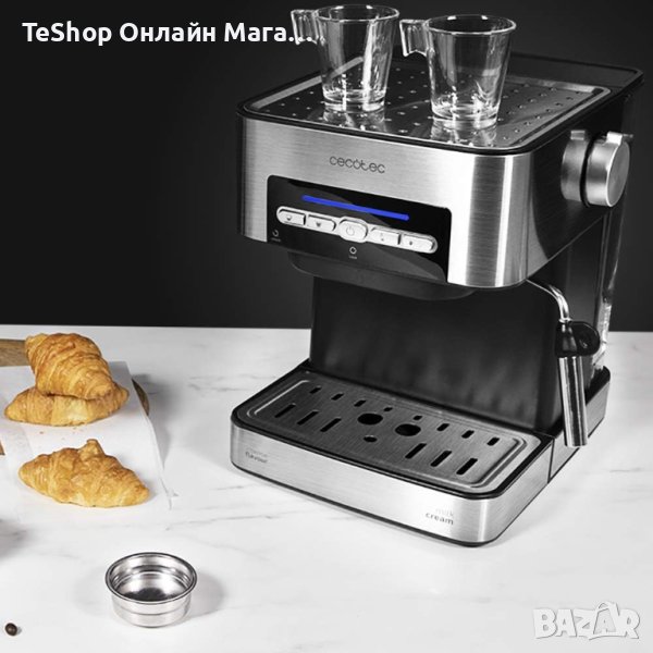 Кафемашина Cecotec Power Espresso 20 Matic за 1-2 чаши, 20 бара, 1,5 л, колба с двоен накрайник, накрайник за разпенване на мляко, рафт за чаши, 850 W, неръждаема стомана