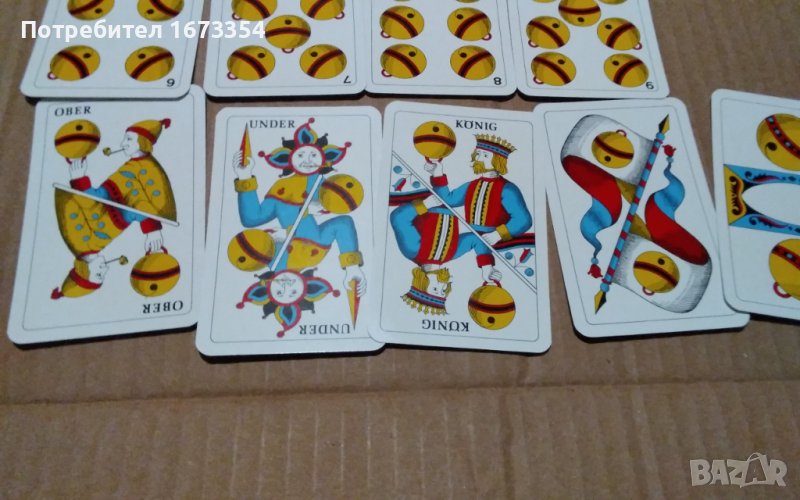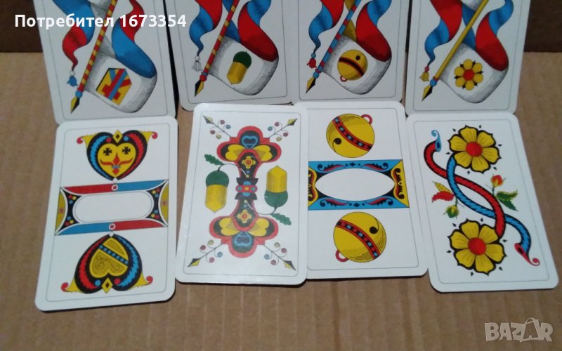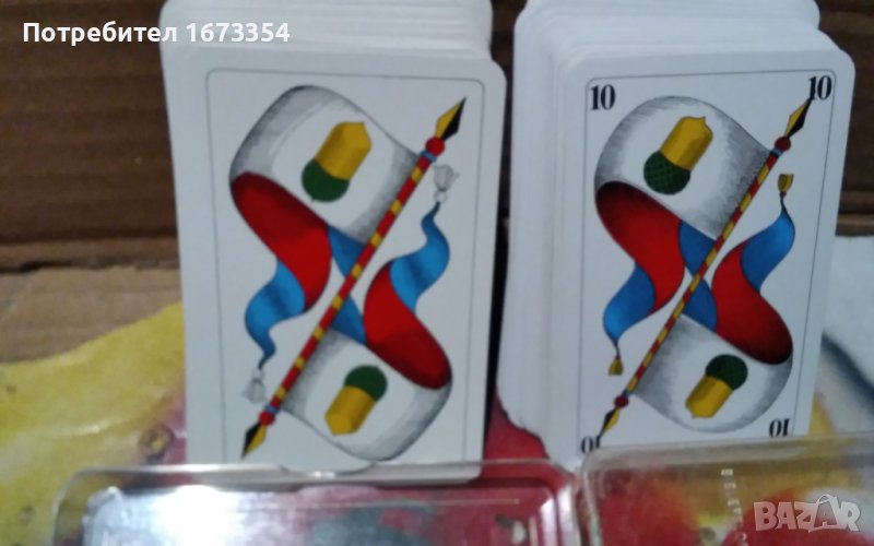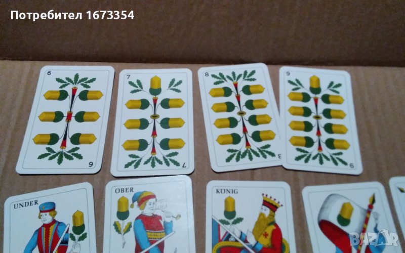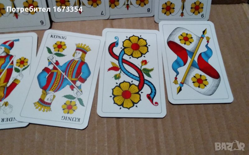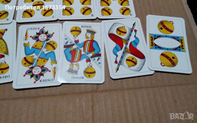 Продавам много редки и много интересни като дизаин ( оформление ) нови Немски карти почти същите като другите в другата ми обява но малко по различни и тези започват от 6 ( шест) и са с размер като другите дължина 9 см и широчина 5,8 см също в пластмасова кутийка но с разлика в 10 ( десетките) тук тя не е означена с цифра ( последната снимка е на двата комплекта ( тестета) и тези с рекламен гръб GLOBETROTTER