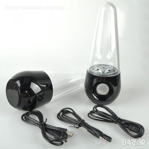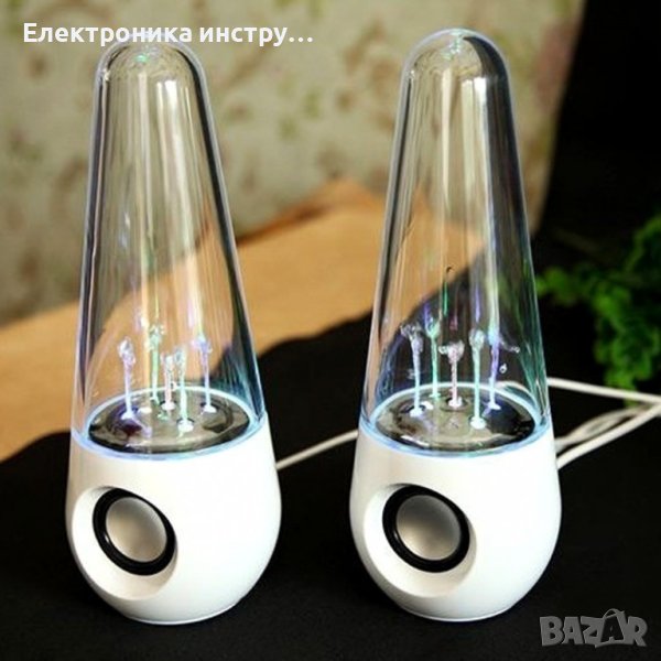 Звукови колонки Water Speakers. Подходящи за компютър, лаптоп, MP3/MP4 плейър, телефон, телевизор и всякакви други устройства с изход за слушалки. Всяка от колонките Water Dancing Speakers има вградени дюзи, които изстрелват фонтанчета в такт с музиката, както и светодиоди, който ги правят още по-вълнуващи. Капсулите са напълно херметични и не се нуждаят от доливане на вода. Системата се захранва посредством USB.