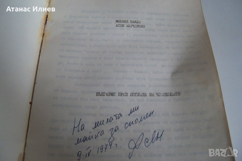 "България през погледа на чужденците" автори Михаил Шакле и Асен Марчевски, с посвещение и автограф на Асен Марчевски за майка му. Асен Марчевски е известен като преводач на Папата, написва книга за истинската история на покушението срещу него. Настоящата книга е ведомствено издание на Комитета за приятелски и културни връзки с чужбина (КПКВЧ) от 1974г. , отпечатана е в ограничен тираж и е предназначена само за вътрешно ползване. Книгата е 178 стр.