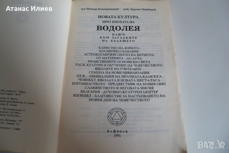 "Новата култура през епохата на Водолея" том 1-ви, автори д-р Методи Константинов и инж. Христо Маджаров. Книгата е с меки корици, 158 стр. Издадена е през 1991г. от издателство "Алфиола".
