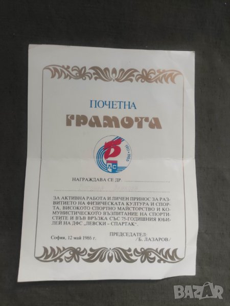 Почетна грамота 75 години Левски Спартак волейбол Оръфан, избелели надписи и подпис