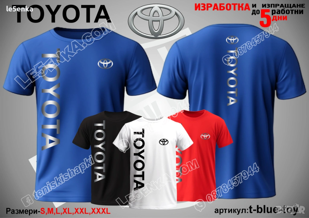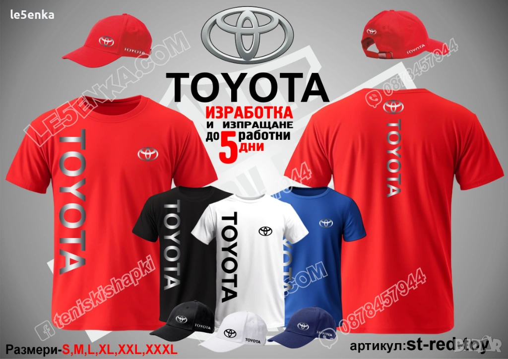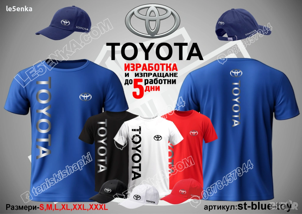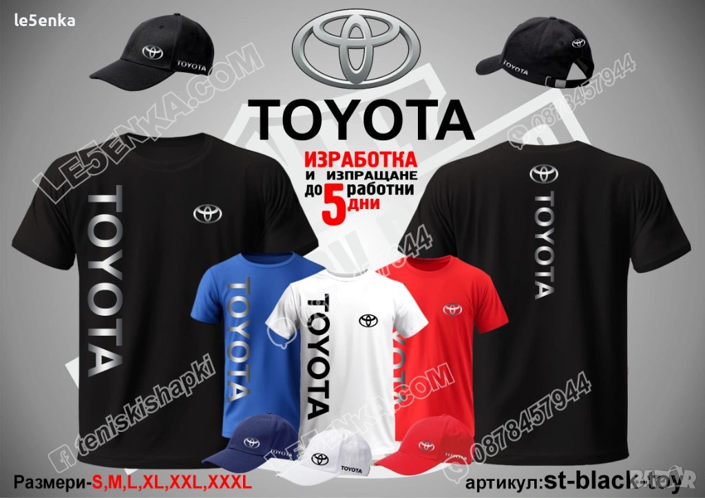 Посочената цена е за шапка и тениска комплект. Само шапка - 18 лв. ,а само тениска - 32 лв. Тениските са изработени от качествена памучна материя - различна номерация и цветове - черен, син, червен и бял. Шапките са памучни с метален клипс или коланче за регулиране - тип бейсболни. Последната снимка в обявата е на таблица с размери за тениските.