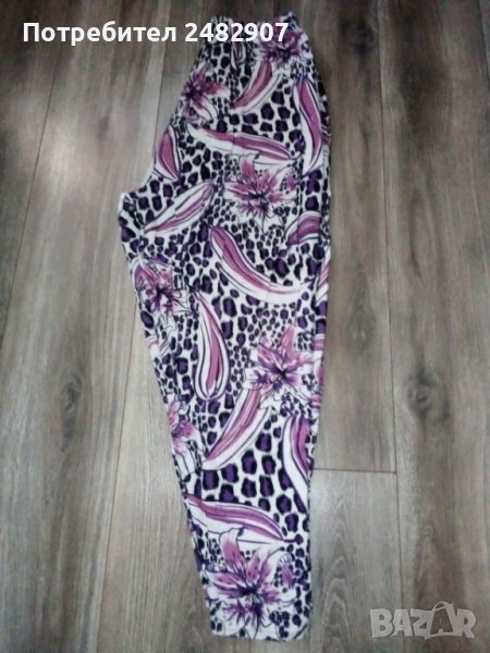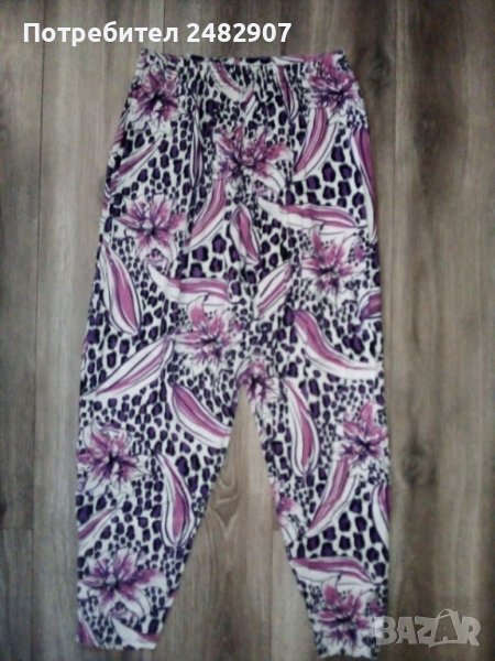 Дълъг дамски панталон, тип "шалвар" от тънък плат с цветни мотиви, размер L. Ширина в талията - 34 см, дължина от талията до чатала - 39 см, дължина от талията до долу - 99 см, ширина на крачола в долната част - 14 см. Много запазен, без забележки, с ластик на талията в задната част и два джоба отпред.