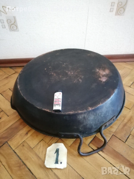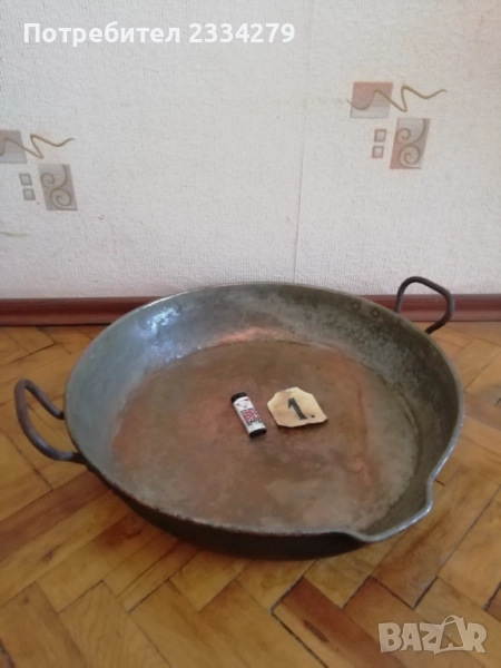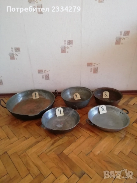 медна тава с улей за исипване, размери широчина 50см.,дълбочина 11см., тежи 2кг. 800гр., цена 65€.; N:2 леген с вместимост 4литра, широчина 30см.,дълбочина 11см., цена 25€.; N:2 леген с широчина 33см.,дълбочина 13см.,вместимост 6 литра, тежи 1кг.500гр. цена 30€.; N:3 Малък меден легне-купана с размери 30х11см., тежи 900гр.,цена 25€.; N:4 медна тава ръчно изкована с размери 32х9см., тежи 1кг., цена 20€.; N:5медна тава ръчно изработена, има накован надпис ,,подарък от прот. Хр. Павлов 1922г., цялата е медна, с размери 40х7см., тежи 1кг., цена 25€. Декорация за битова къща,механа,двор или ползване.