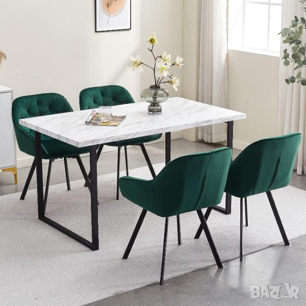 Кадифеният трапезен стол се поддържа от масивни крака с прахово покритие за издръжливост.