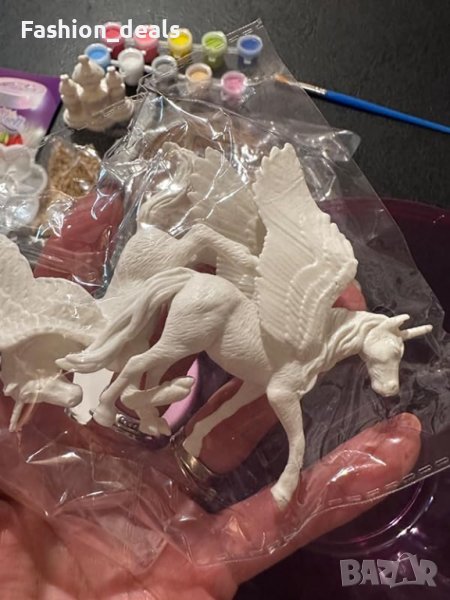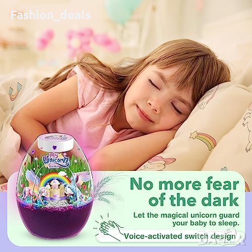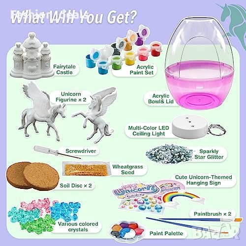 Включва различни компоненти, като фигурки на еднорози, комплект акрилни бои, дискове с почва, LED светлина за таван и др.
