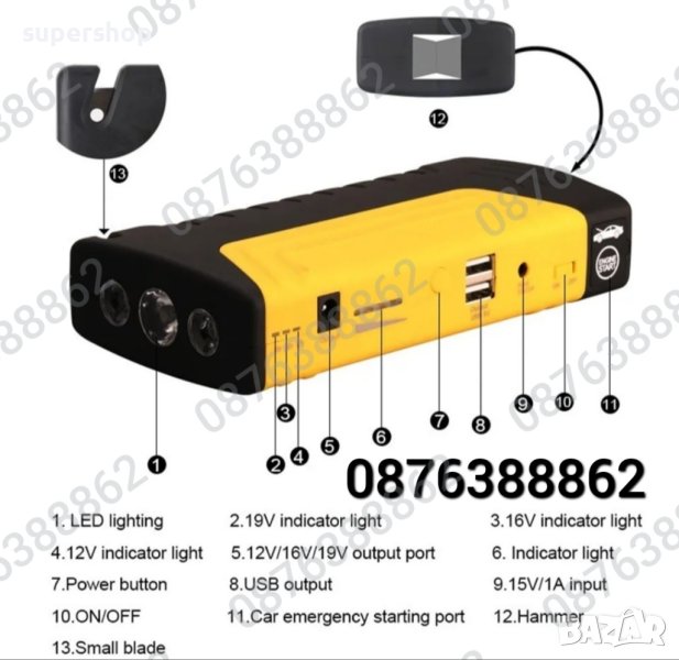 Този авариен комплект с висока мощност е проектиран с цел да осигури максимална сигурност и удобство. Включва компактна и лека батерия с вградени защитни механизми, които предпазват от презареждане, късо съединение и прегряване. Също така, комплектът е оборудван в компактно куфарче. Вградена светлина за спешни ситуации, което го прави идеален за използване при нощни аварии или при намаляване на видимостта.