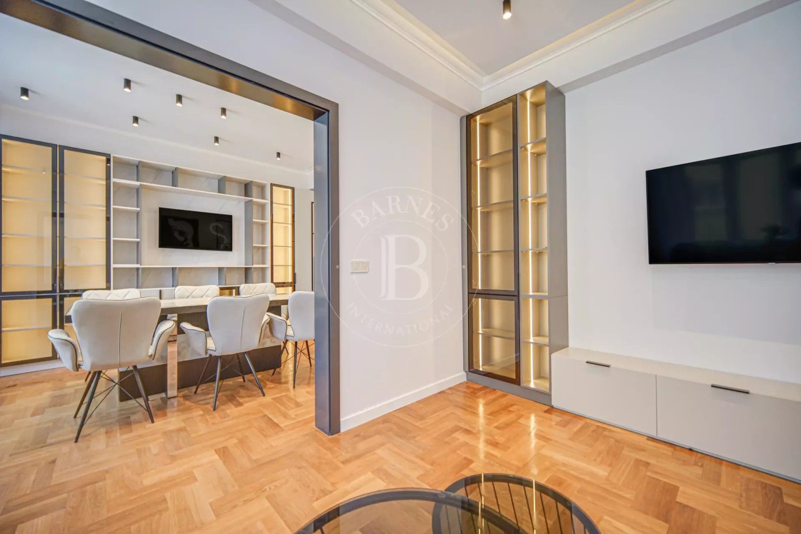 Трапезария с маса за хранене от мрамор и витрини с лед осветление;