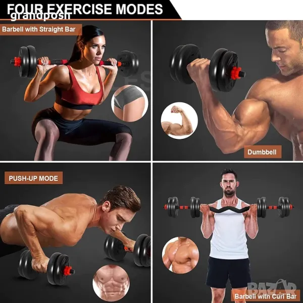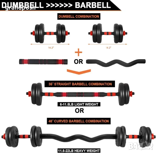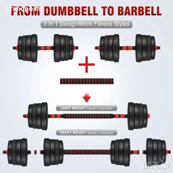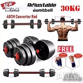 РЕГУЛИРАНЕ НА ТЕГЛОТО Дъмбелите може да се свържат чрез лостове, за да станат щанги, които са твърди и здрави. Този комплект домашен фитнес уред има много възможности за тренировка може да отговори напълно на нуждите от упражнения за горни и долни крайници. Този комплект Ви позволява да тренирате по всяко време и навсякъде!