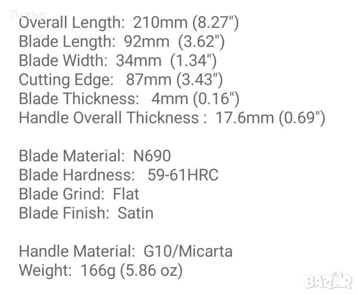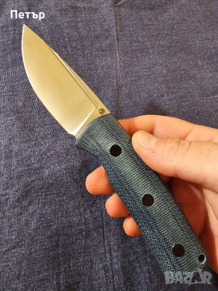 Поради известността на сгъваемия модел Petrified Fish направиха фикс модел с N690 фултанг острие, чирените в случая са синя микарта. Повече характеристики в последните снимки.