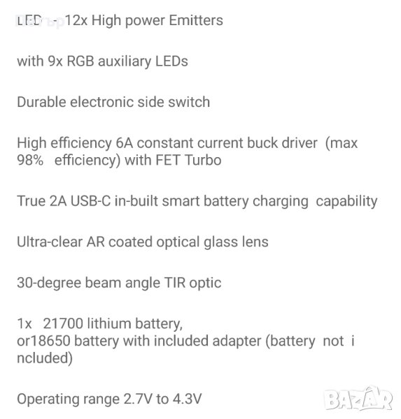 Абсолютно впечатляващо фенерче като изработка, драйвер, диоди, сила на светене, големина и екстри. Това е Fireflylite E12R с 12 броя емитери Nichia 519A 5700k High CRI, 9 AUX RGB диода, 21700 батерия, Type-C зареждане на батерията 2А, клипс, доста силен магнит в капачката, изключително ефективен 6А бък драйвер(98% max) за ниските режими и фет турбо което е около или над 10 000 лумена. Фенерчето е с размери 47.6х26.5х120мм. Тежи 150 грама без батерия. Индикация на заредена батерия в бутона. Управлението на фенера е с фирмуер Anduril 2 който има много опции и много интересни неща. Страхотен EDC фенер.