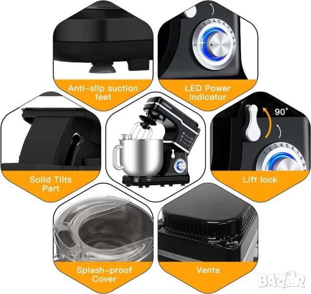 【7L купа с голям капацитет】 - 7L купа от неръждаема стомана за храни ви позволява по-лесно да правите торти, хляб, бисквитки, вафли и други сладкиши. Вертикална купа за смесване от неръждаема стомана с устойчива на пръски плоча, която минимизира пръските при смесване с висока скорост