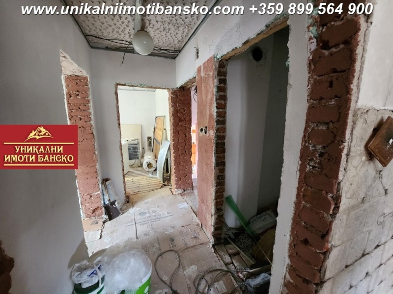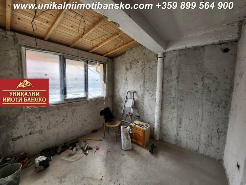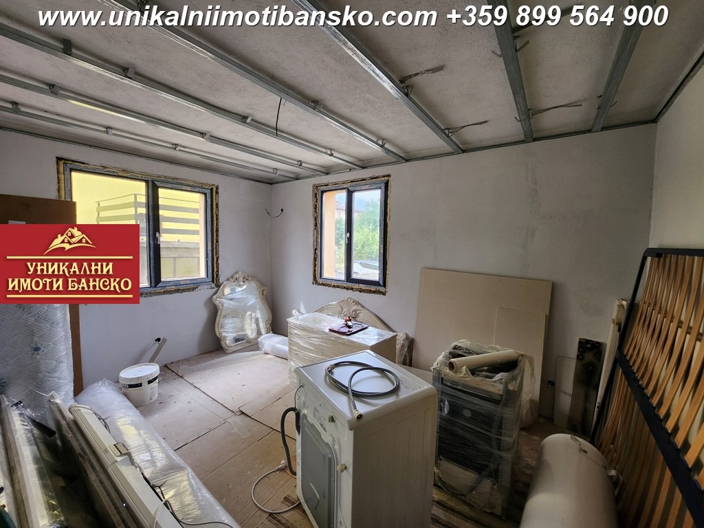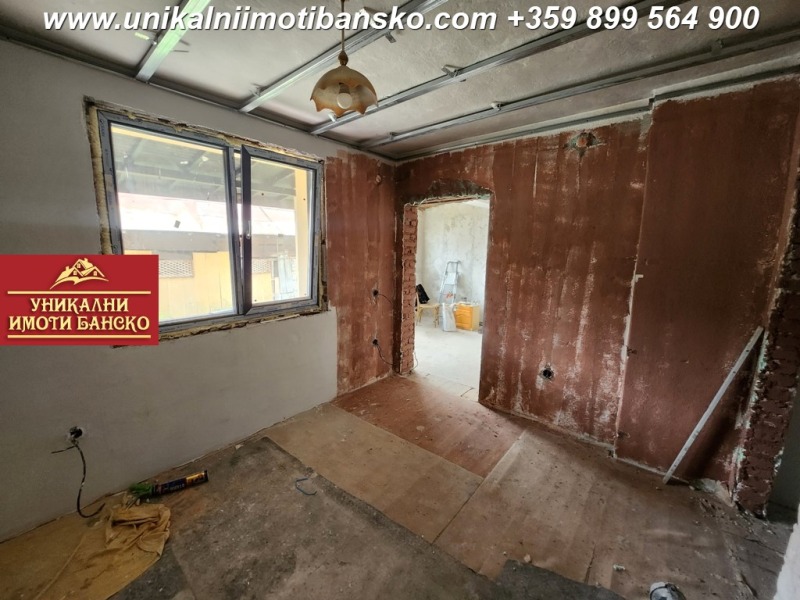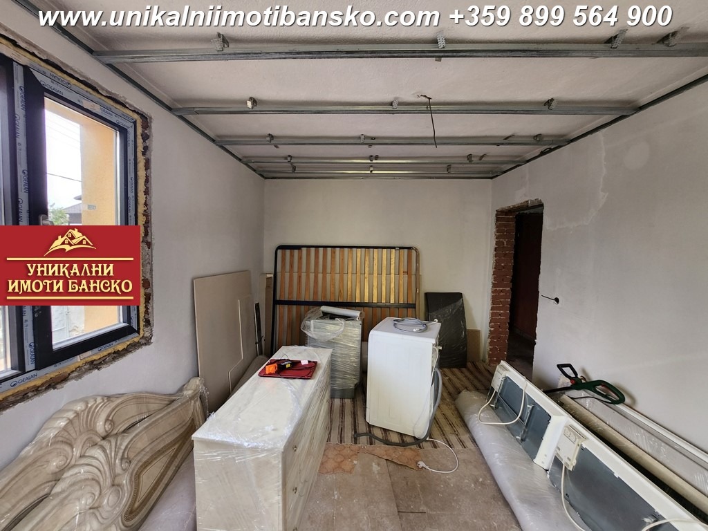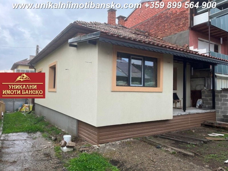 www.unikalniimotibansko.com БЕЗ КОМИСИОННА ОТ КУПУВАЧА !!! Предлага се за продажба реновирана едноетажна къща с възможност за нейното преустройство в дву или триетажна такава. Разположена на тиха и спокойна улица в близост до центъра на град Банско и на 3 мин. с кола до ски зоната. Построена 1967г., с РЗП 100 кв.м, площ на парцела 270 кв.м. Къщата е на един етаж с плоча, като има и подземен етаж, тавански етаж и отделна постройка на двора с площ от 53 кв.м. Къщата разполага с четири просторни самостоятелни стаи, които са на шпакловка първа ръка ( кухня, огромна дневна, две спални ) и баня с тоалетна. ВиК и ел. инсталациите са изцяло нови. Подовата настилка е дюшеме, което също е ново. Къщата е с външна изолация, положен е стиропор с дебелина 10см, а дограмата е от висок клас. Има предвидено място за паркиране на автомобил. Отлична инвестиция в имот, който може да се използва за постоянно живеене или отдаване под наем.