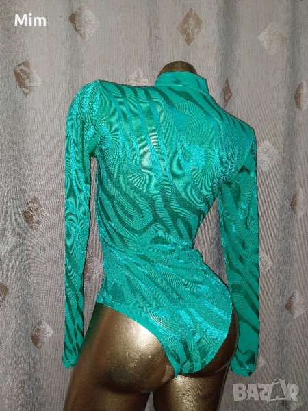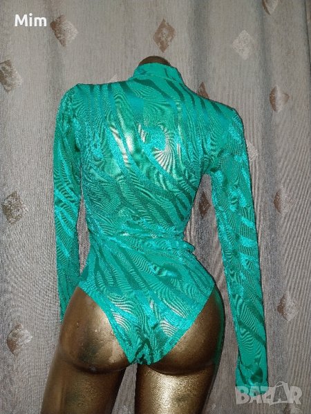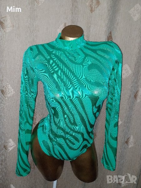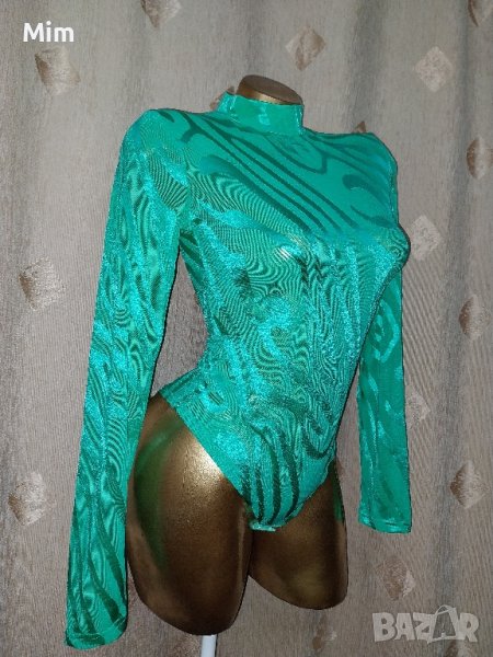 Еластично ,прозрачно боди в зелено на фигури, закопчаването е отдолу с телени закопчалки. Неразличимо от ново без хартиен носител.