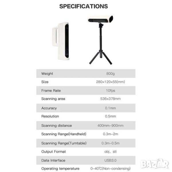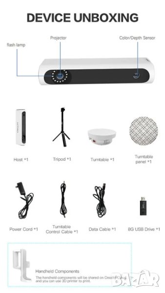 х Кабел за данни 1 x 3D скенер 1 х Статив 1 x Turntable 1 x Turntable panel 1 x