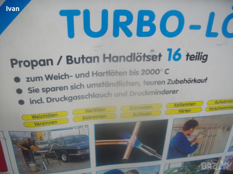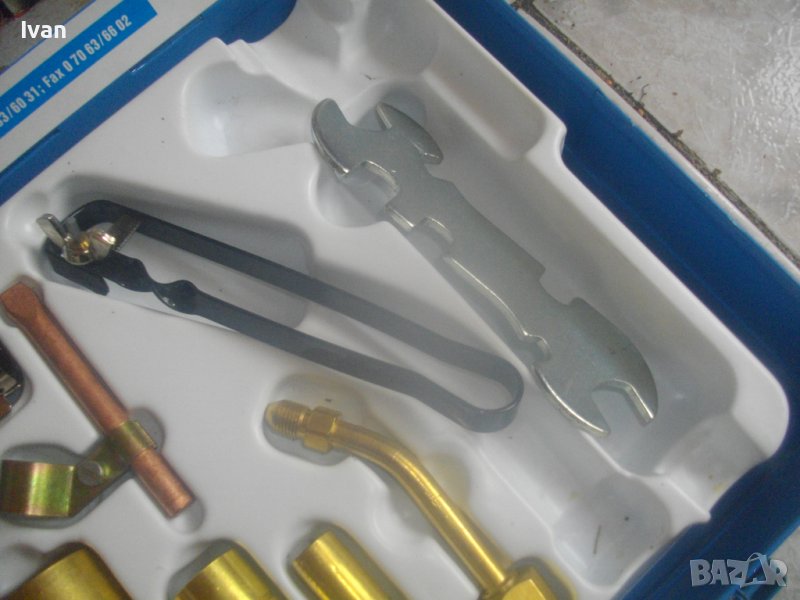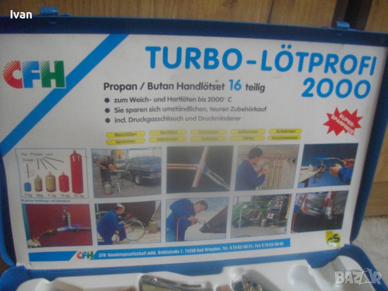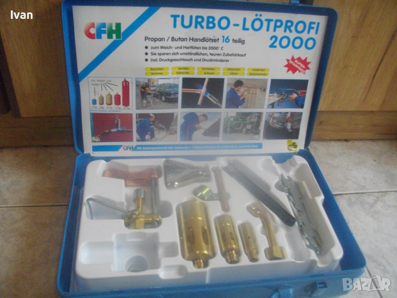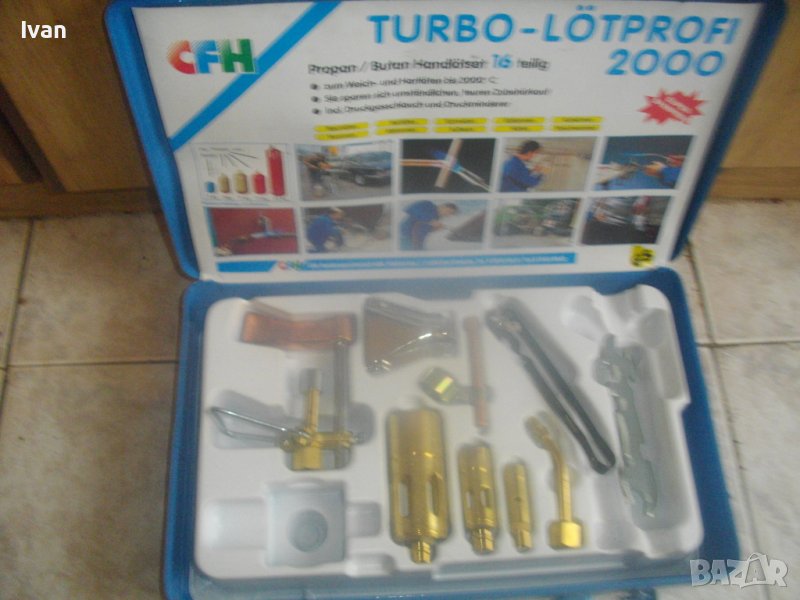 ОПИСАНИЕ на немски нов комплект непълен газов поляник и контактни дюзи за гозова горелка. Старо професионално каество висок клас. Марка/модел/маркировки - CFH Turbo LotProfi 2000. 16 teilig TUV Product. Съвсев нов, неизползван и неупотребяван. Непълен комплект - липсва горелката. От 16 части в комплекта са налини 9 бр. части. Поялник, дюзи, гаечеен ключ и други аксесоари. Комплекта е с оригиналния си немски метален куфар с размери 390 х 240 х 190 мм. Вложка ПВЦ в куфара за копонентите. Производител на комплекта - Proppan Butan CFH Handelsgesellschaft mbH Wimpfen.