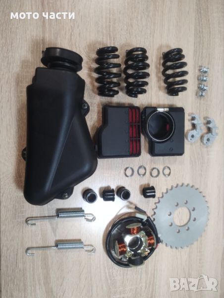 Продавам чисто нови части за мотопеди пух ,пиаджо ,томос венци (зъбчатки) предни и задни различен брой зъби ,вериги, бутала , карбуратори, втулки за карбуратори , пружина застопоряваща втора скорост- фиба и много други части който не са на снимката за информация за цени и наличности позвънете на телефона посочен в обявата