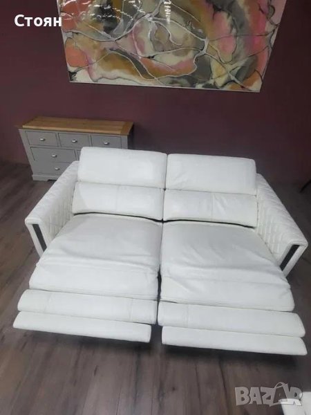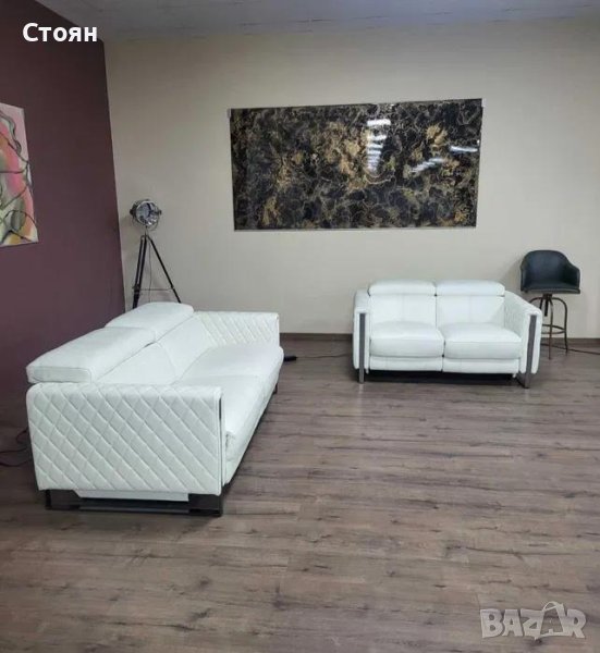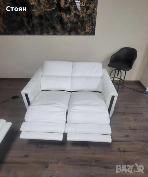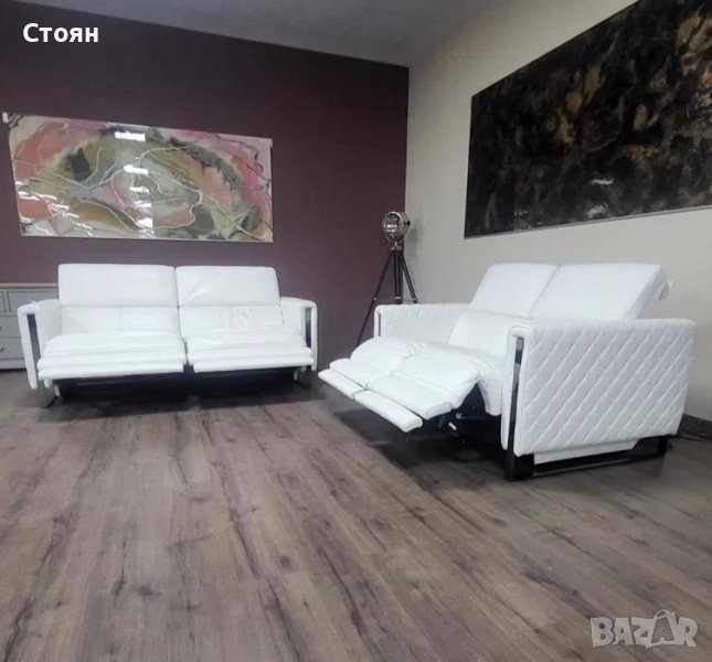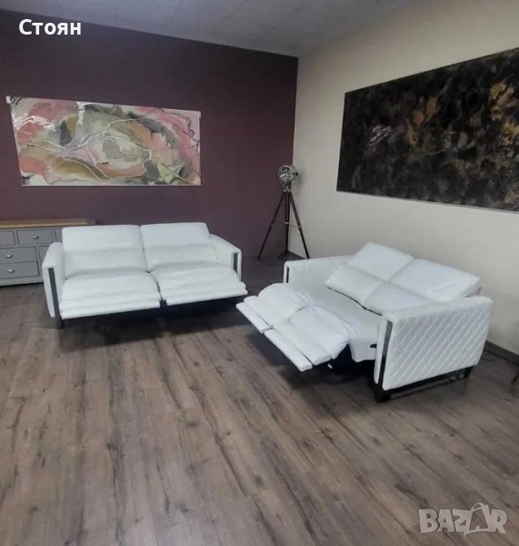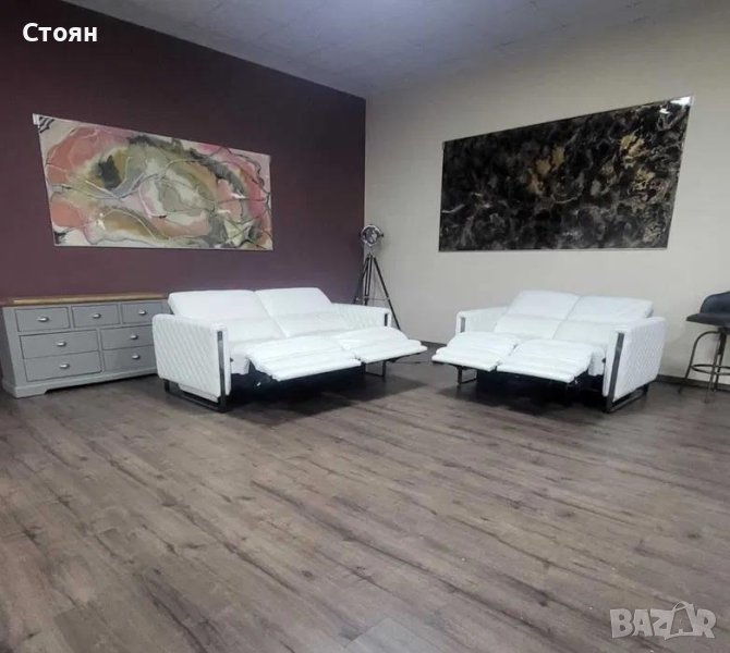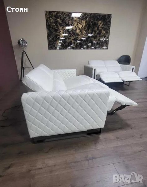Бял кожен комплект дивани тройка и двойка с релаксиращ механизъм → Обява 42422381