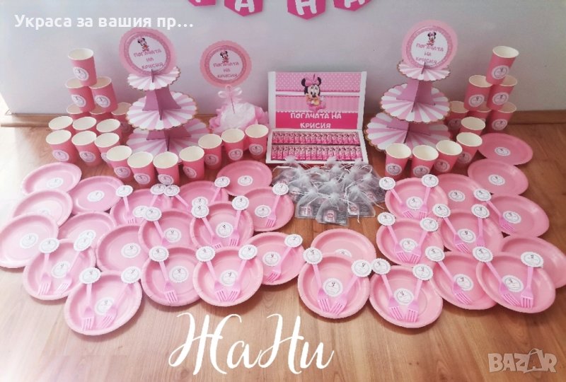 Украса За бебешка погачаВсеки клиент сам избира какви аксесоари желае да включва украсата, както и нужната бройка. * надпис* Месал за разчупване на питката с името на детето и датата (печат /текстилно фолио)* малка кърпичка за паричките с име *боди с име и дизайн съобразен с темата на празника *бонбони с дизайн съобразен с темата на празника *книга за пожелания с химикал * карти за пожеланията на орисниците, може да се поставят в папка * топки и цветя от тишу за украса * чаши * чинийки * вилички * Сламки* Салфетки боди/рокля/риза/едноцветни с декорация по темата * топери с пожелания за орисане на бебе кръгли или във форма на животни, със снимка на детето или с надпис по поръчка за украса или подаръчета за гостите *Украса За маса * стойка за мъфини* топери за мъфини *табела за врата и за маса * табела бебешко шише * табела бебешка количка с надпис * Покани * подаръчета за гостите