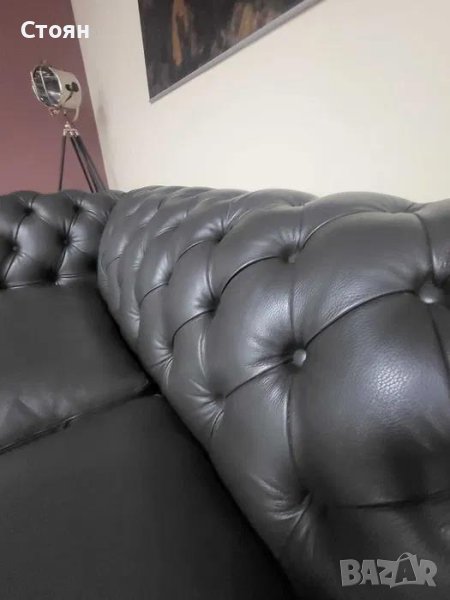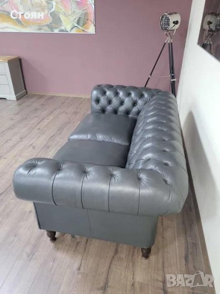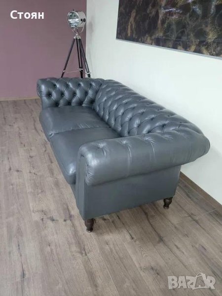 Дизайнерски сив кожен диван тройка тип Честърфийлд → Обява 42422846