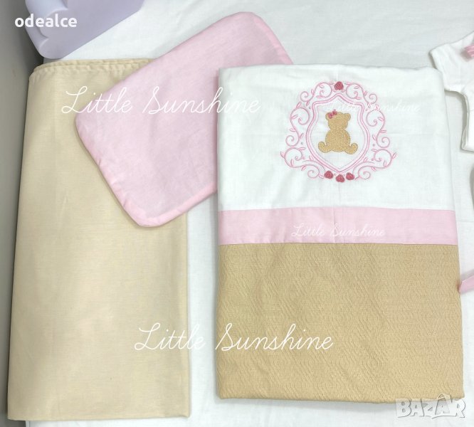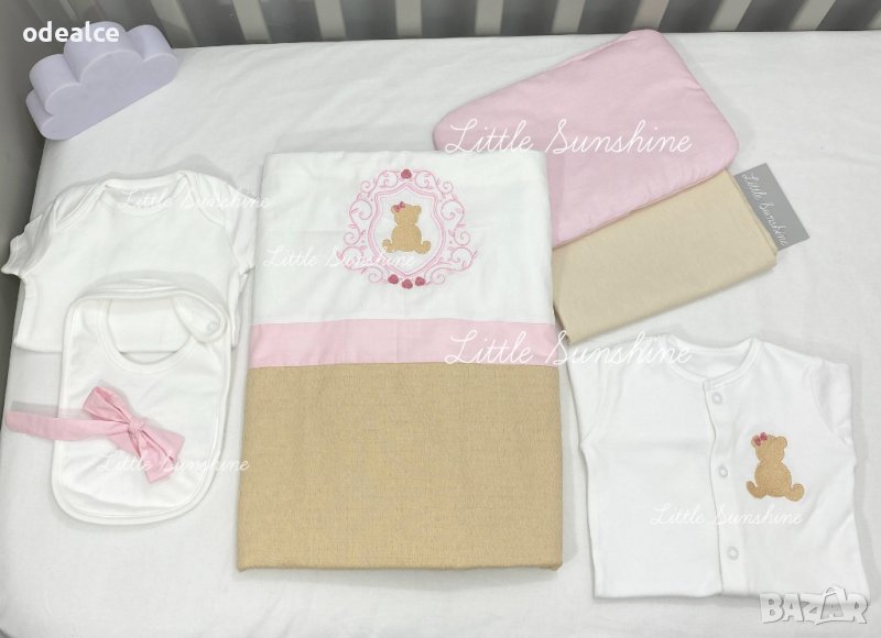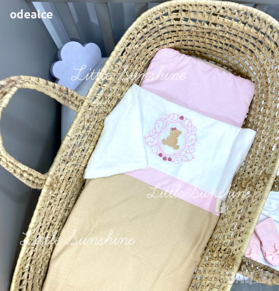 Искахме да направим комплект за изписване, който да можете да използвате още време и след този неповторим момент! Затова добавихме малка бебешка възглавничка и памучно чаршафче, което може да използвате като комплект за количка, люлка или в легълцето след това.