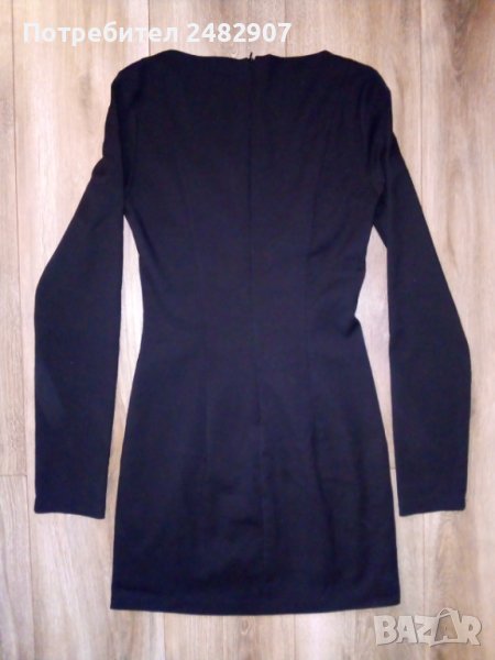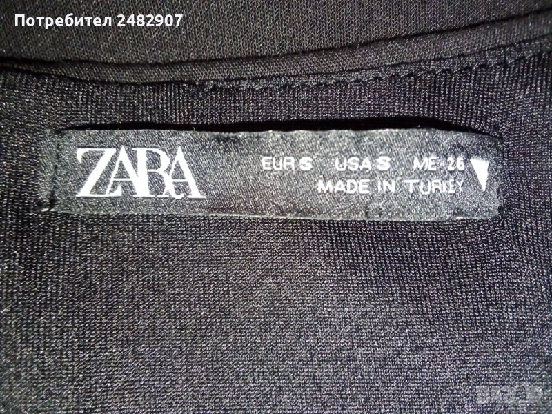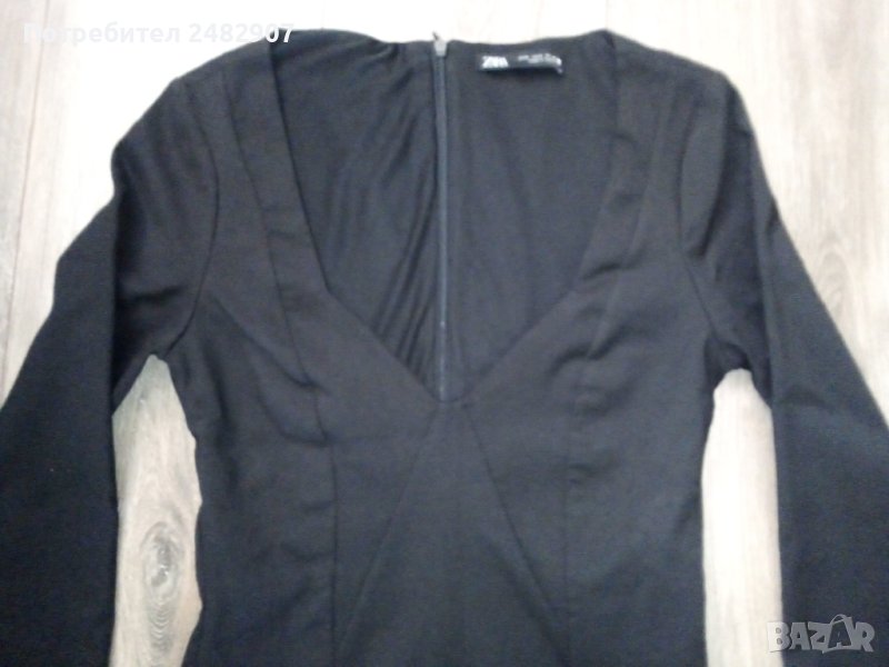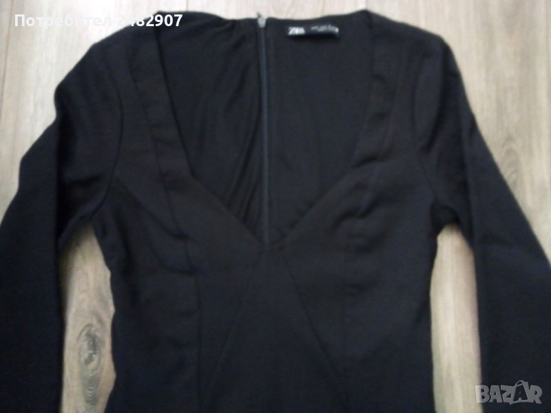 Елегантна черна дамска рокля "ZARA" с подплата и дълбоко деколте, размер S. Съдържа 53 % памук, 44 % полиестер и 3 % еластан. Ширина в раменете - 36 см, ширина под мишниците - 40 см, ширина в долната част - 46 см, дължина от рамото до долу - 81 см, дължина на ръкава от рамото - 64 см, ширина на ръкава в долната част - 10,5 см. Обличана е веднъж за повод, отлично състояние, без забележки, леко еластична, със закопчаване с дълъг скрит цип на гърба. Дължина на ципа - 52 см.