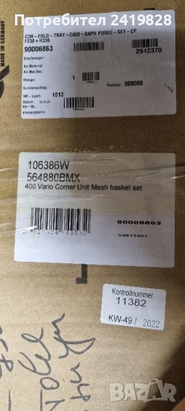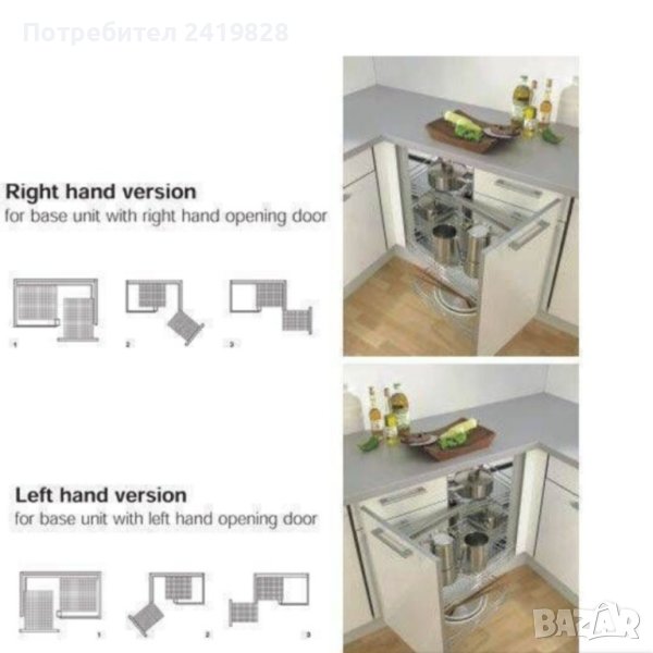 Vauth Sagel VS COR Fold Swing Out - Размер на шкафа:800 мм (400 мм врата) 900 мм (450 мм врата)Тип кошница:Линеен проводник Chrome ОписаниеЛяво или дясно завъртане Wari Ъглов модул за съхранение Пълен комплект, издърпващо действие с плавно затваряне. Произведено в Германия от Vauth Sagel.Стоманени мрежести хромирани кошници за съхранениеЗа минимална ширина на шкафа от 800 мм или 900-1000 ммПроизведено в ГерманияВградено плавно затваряне Минимална вътрешна височина: 530 ммМинимална вътрешна дълбочина: 485 ммОсновен монтажФиксиране на входна вратаКапацитет на коша: 8 кгКомплектът включва:1x комплект рамкиЗадна окачена рамка и основна релса за монтаж; тръбна стомана със сребърно епоксидно покритиеКаса на врата с шарнир; тръбна стомана със сребърно епоксидно покритиезадна рамка; тръбна стомана със сребърно епоксидно покритиеСледваща рамка на вратата; подобрена пластмаса от фибростъклоТабла за окачване на панела на вратата; сребристо оцветена стомана, регулируема в 3 посоки, 800 mm версия, за да отговаря на 400 mm ширина на вратата, 900 mm версия, за да отговаря на 450/500/600 mm ширина на врататаФиксиращи винтове и инструкции за монтаж2x стоманени мрежести хромирани кошници за съхранение (отзад)2x стоманени мрежести хромирани кошници за съхранение (врата)